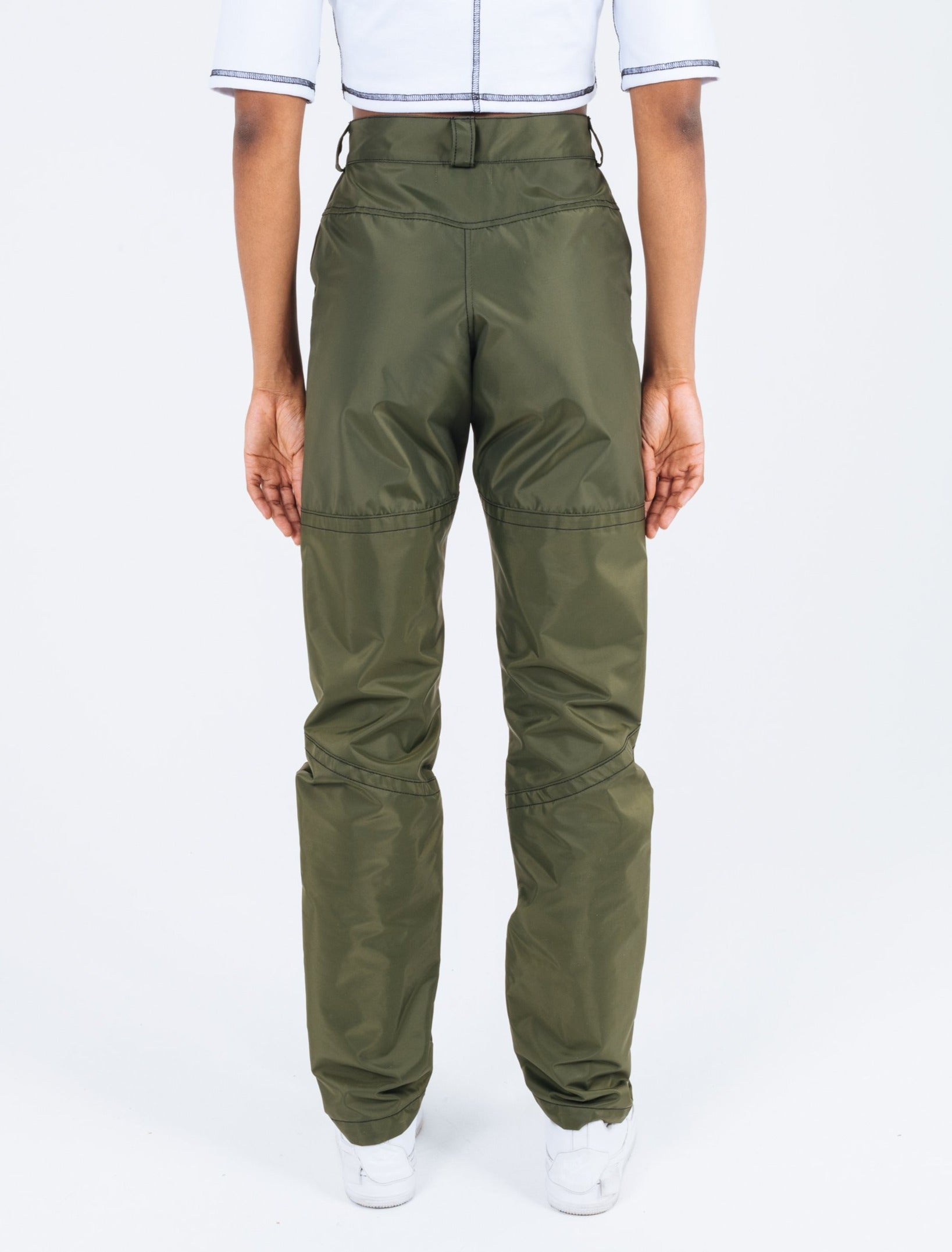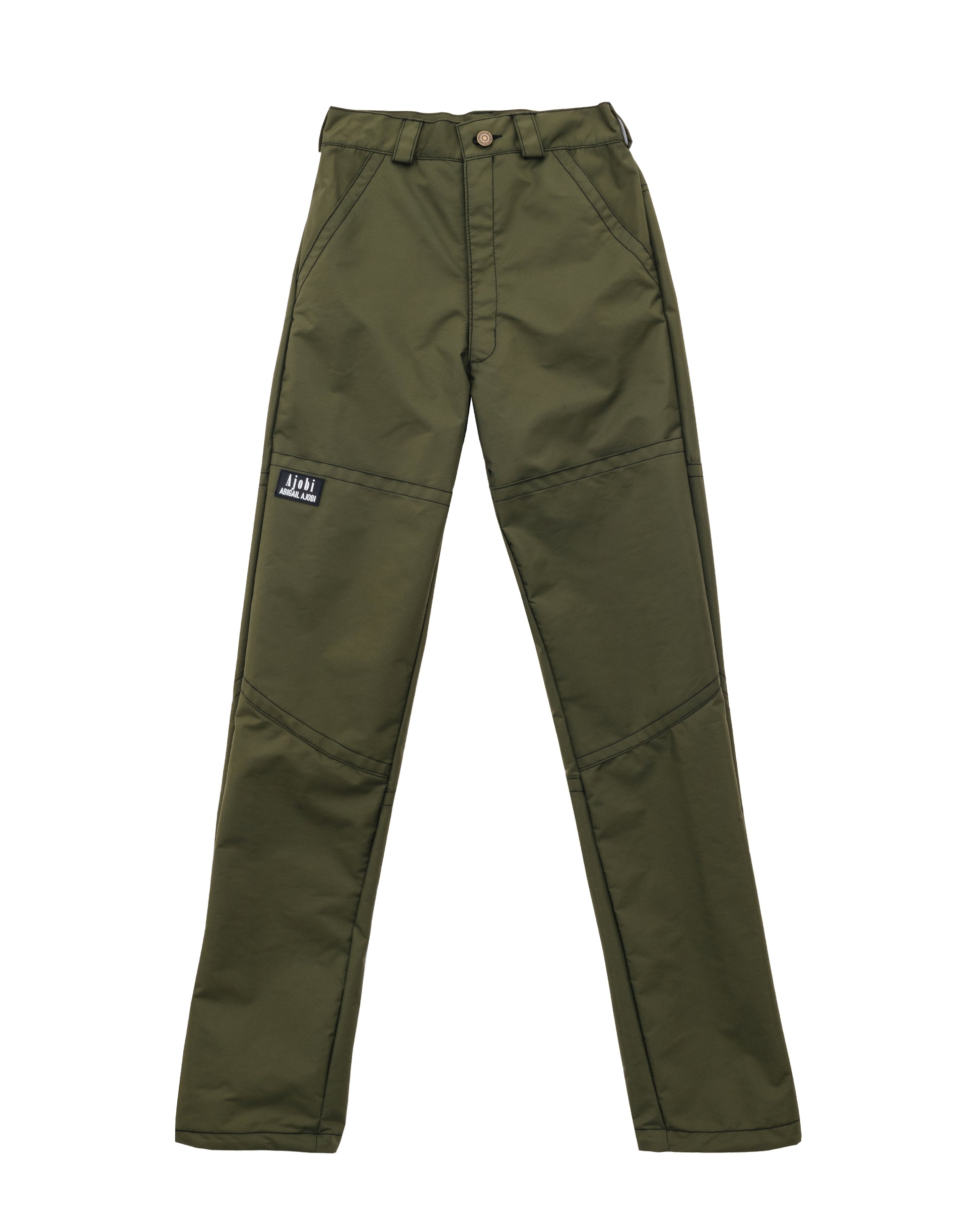 Mid-rise Waterproof trousers with 2 large hidden front patch pockets and an adjustable shock cord hem at the cuff of each trouser leg.