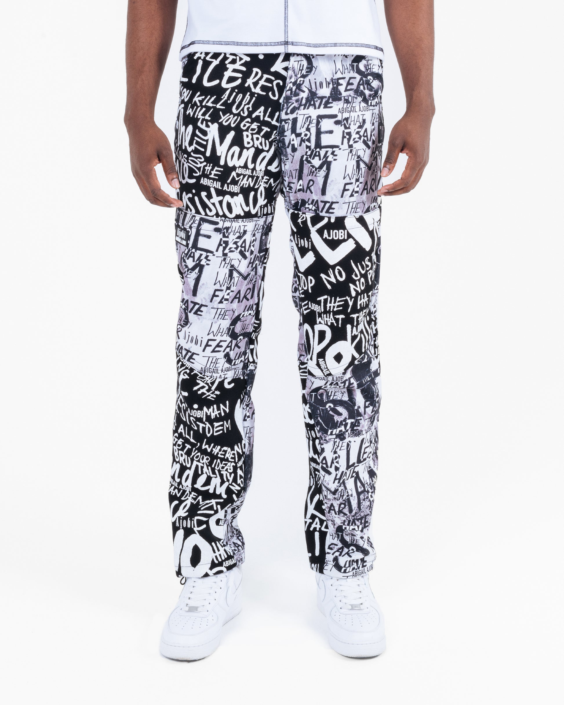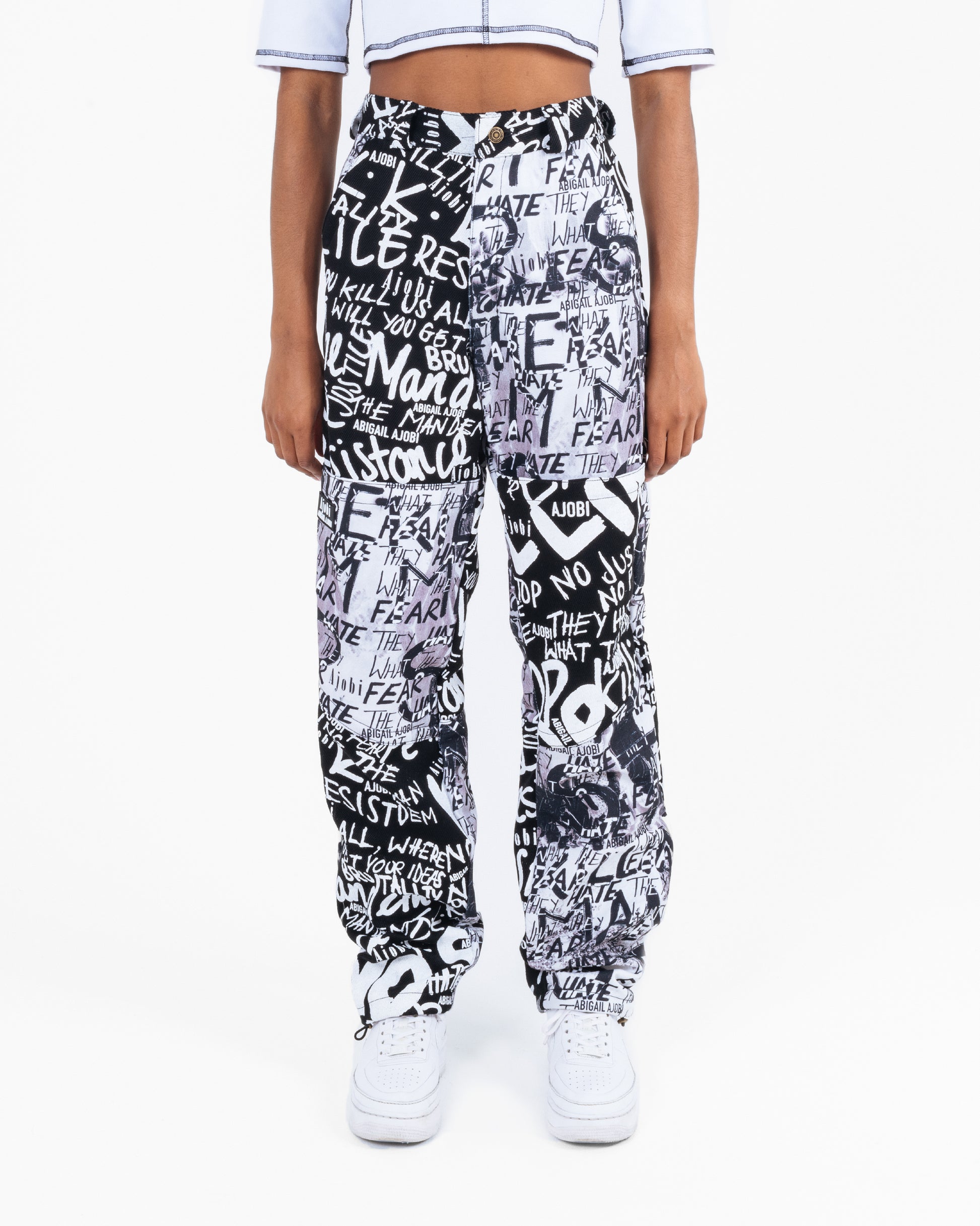 Mid-rise trousers with a combination of Hand Printed and digital printed panels. with 2 large hidden front patch pockets and an adjustable shock cord hem at the cuff of each trouser leg.