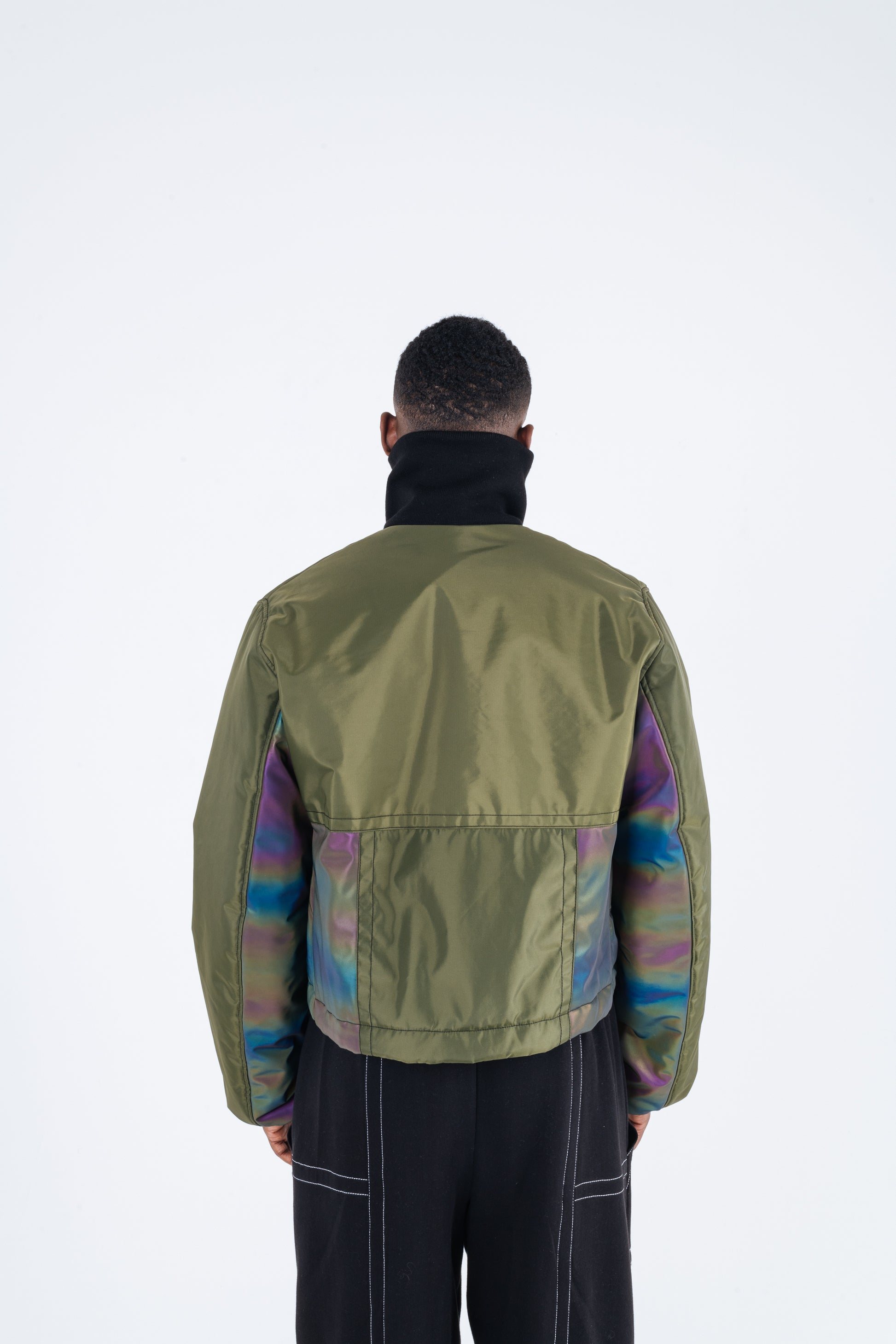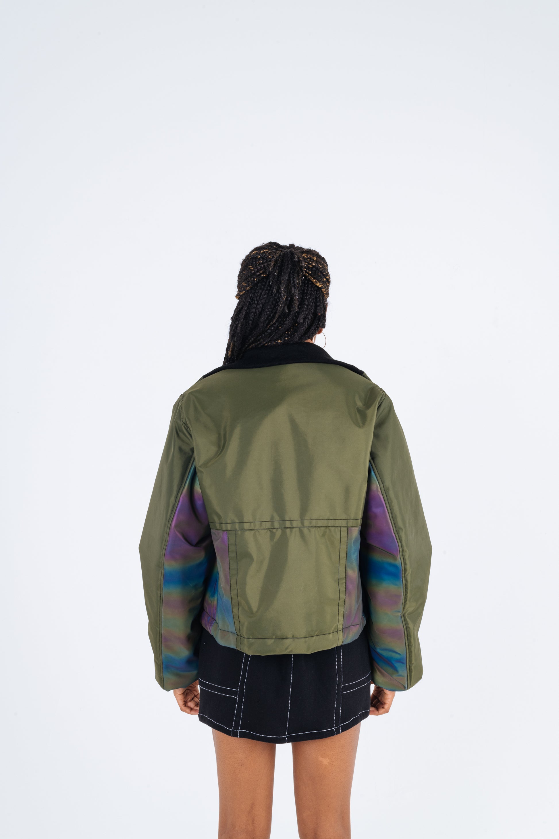 Waterproof bomber coat with Detachable 3D pockets, Multicoloured reflective panels and shock cord adjustable hem. Comes with hidden side pockets and inside pocket also. This is a cropped coat with an oversized fit.